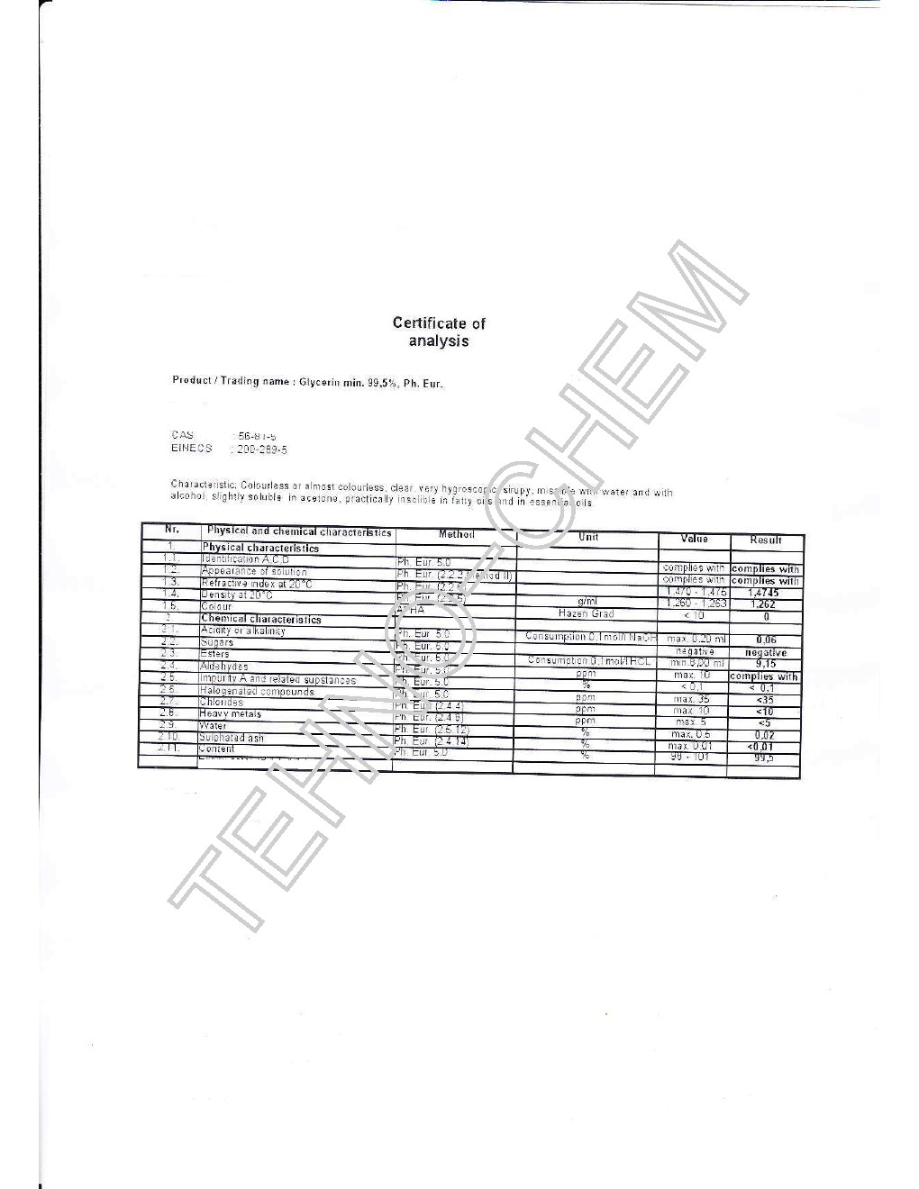 Glicerin (glicerol) je jednostavno poliolno jedinjenje. To je bezbojna, viskozna tečnost bez mirisa, koja je najčešće u upotrebi u farmaceutskom kvalitetu. U ponudi je farmaceutski glicerin u bačvama od 250 kg i kanticama od 5 litara renomiranih proizvođača iz Češke, Nemačke i Švedske. Najviše se koristi: