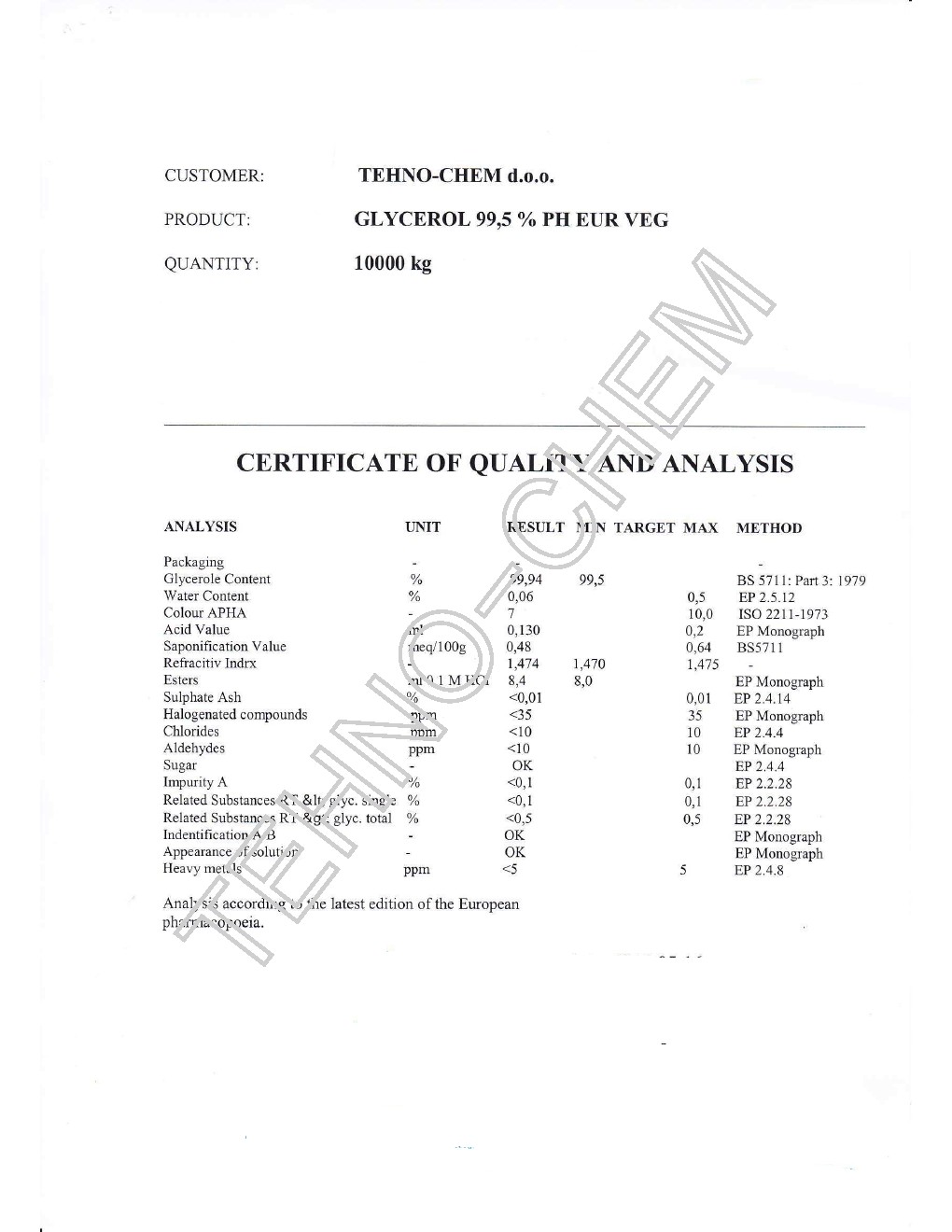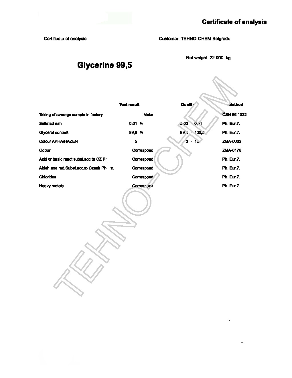 Glicerin (glicerol) je jednostavno poliolno jedinjenje. To je bezbojna, viskozna tečnost bez mirisa, koja je najčešće u upotrebi u farmaceutskom kvalitetu. U ponudi je farmaceutski glicerin u bačvama od 250 kg i kanticama od 5 litara renomiranih proizvođača iz Češke, Nemačke i Švedske. Najviše se koristi: